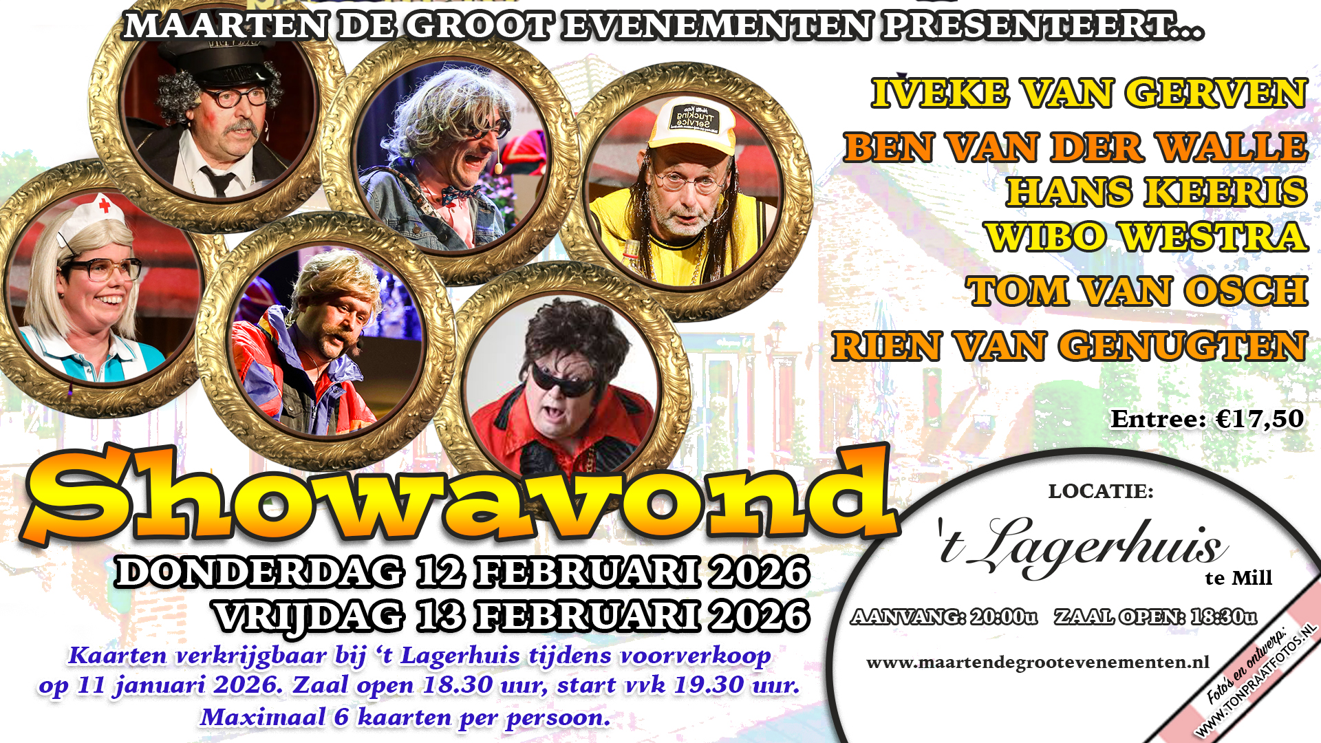 De jaarlijks terugkerende showavonden in ’t Lagerhuis in Mill vinden dit jaar plaats op 12 en 13 februari. Kaartverkoop op 11 januari 2026.